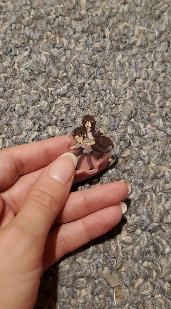 Want to show off that you read a massively tl;dr fic for an old indie comic from the 90s? Well look no further! This little acrylic pin is 1.5 inches with a heart shaped post. You can stick Edgar and Scriabin anywhere! It's pretty thick and sturdy too.